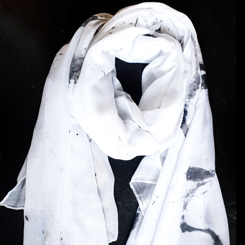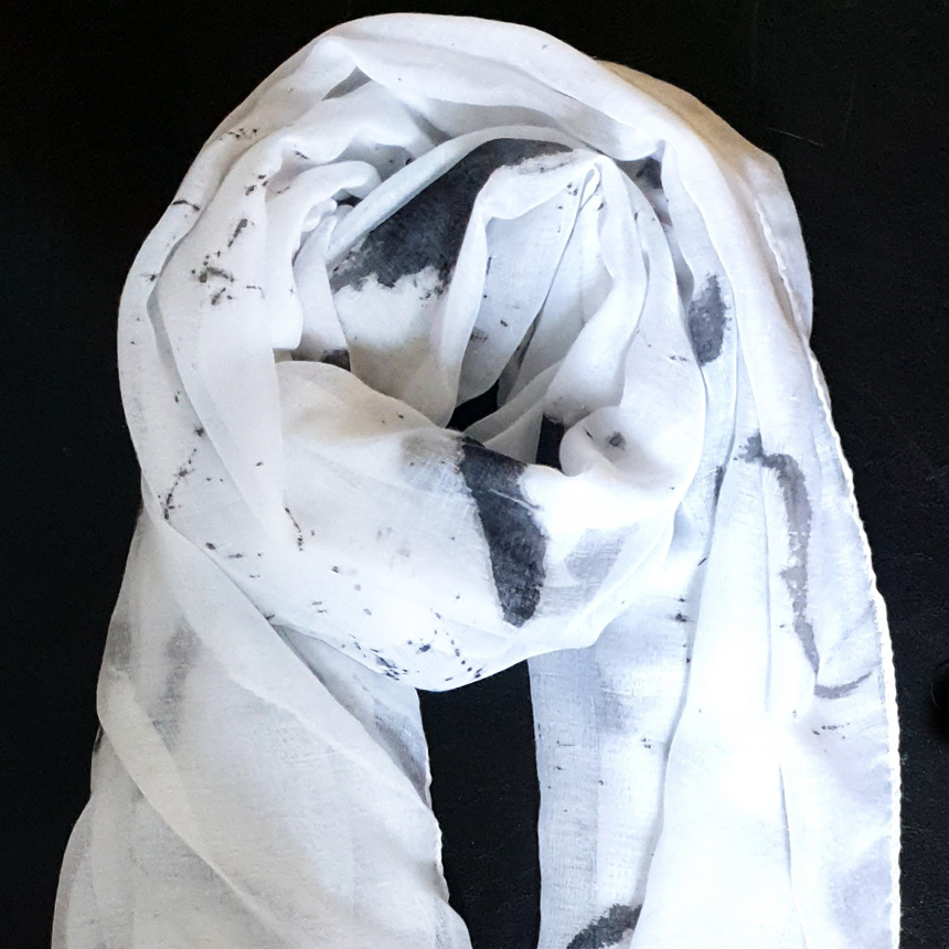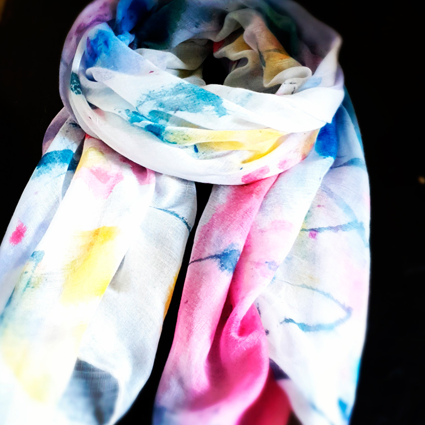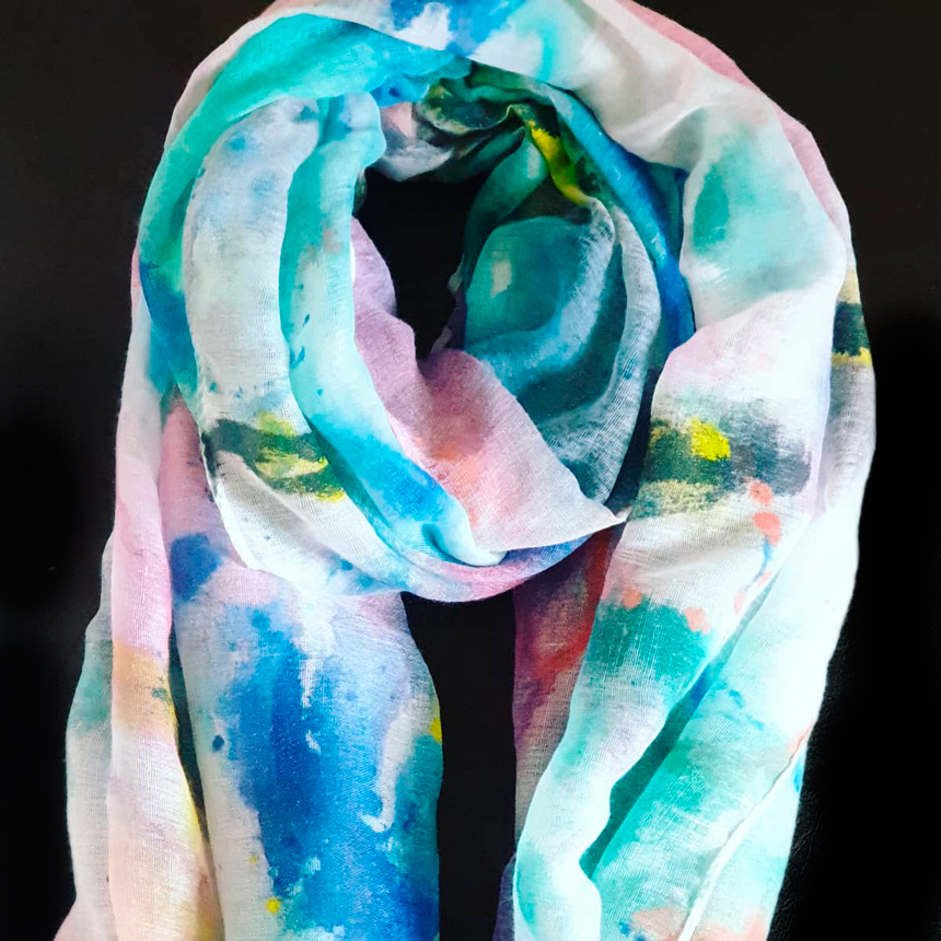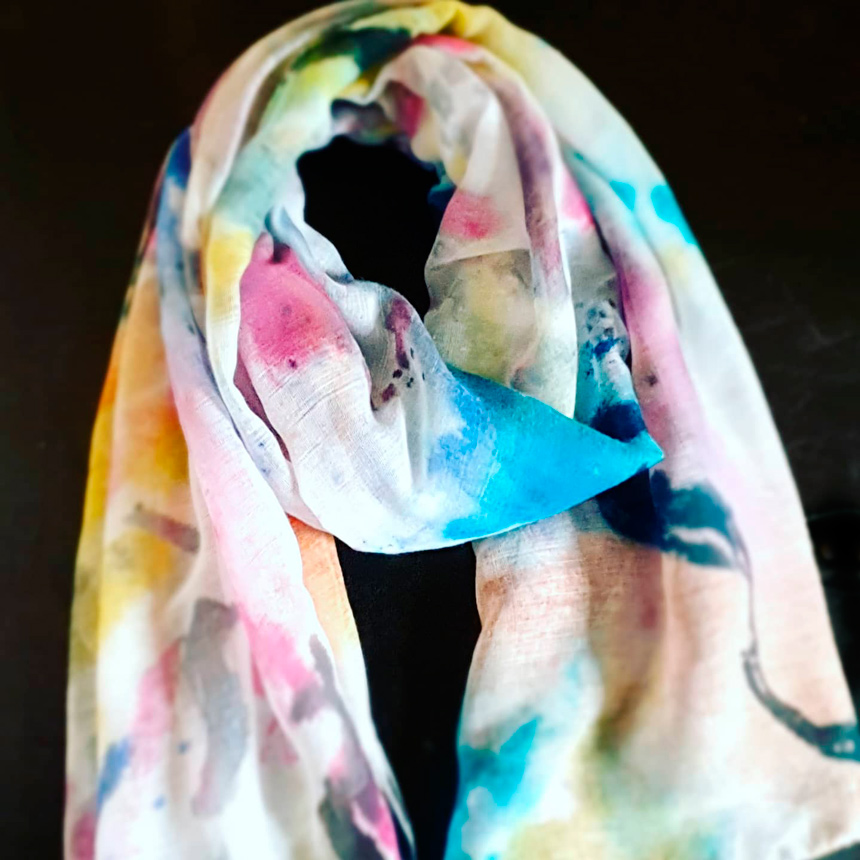 Each scarf is carefully designed in the studio and then handpainted en plein air – each one is a totally unique piece of wearable art. You’ll never bump into someone wearing the same scarf!