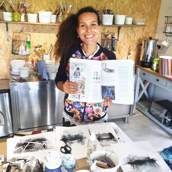 You never really know what kind of a print you will make, it is very dependent on the conditions; a sudden breeze, the movement of a dog or just your own breathing can affect the image, changing it in some way. It’s exciting knowing that just as every snowflake is different, so, too, is every print. No matter how many I produce no two will be the same; each one will be unique and special in some way. The prints are used in a number of ways – for book covers, endpapers, framed original prints or wrapping paper – depending on the purpose and the type of paper used. If you love playing with inks and hearing the soothing sound of water you will love this aqueous surface design printing method.”